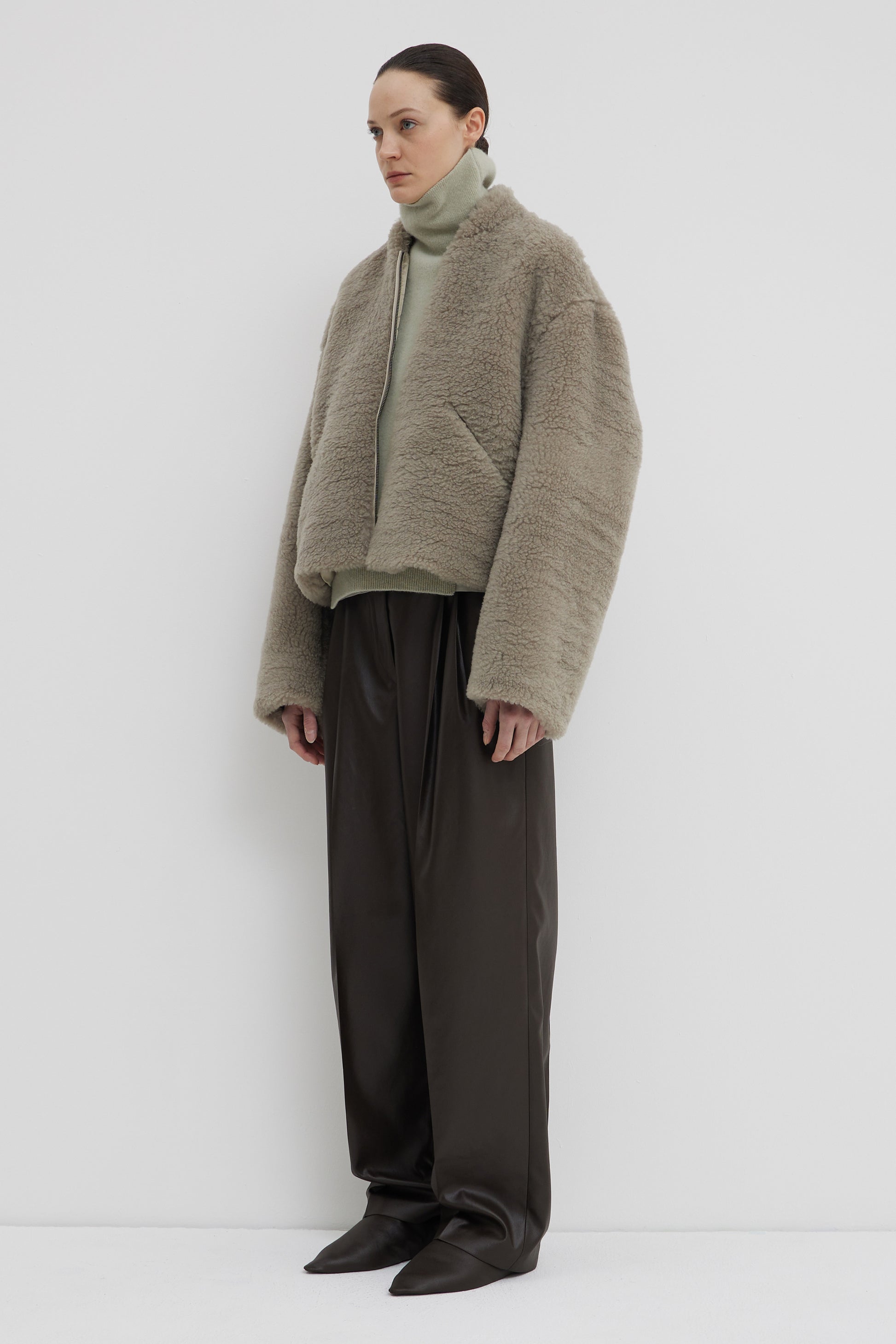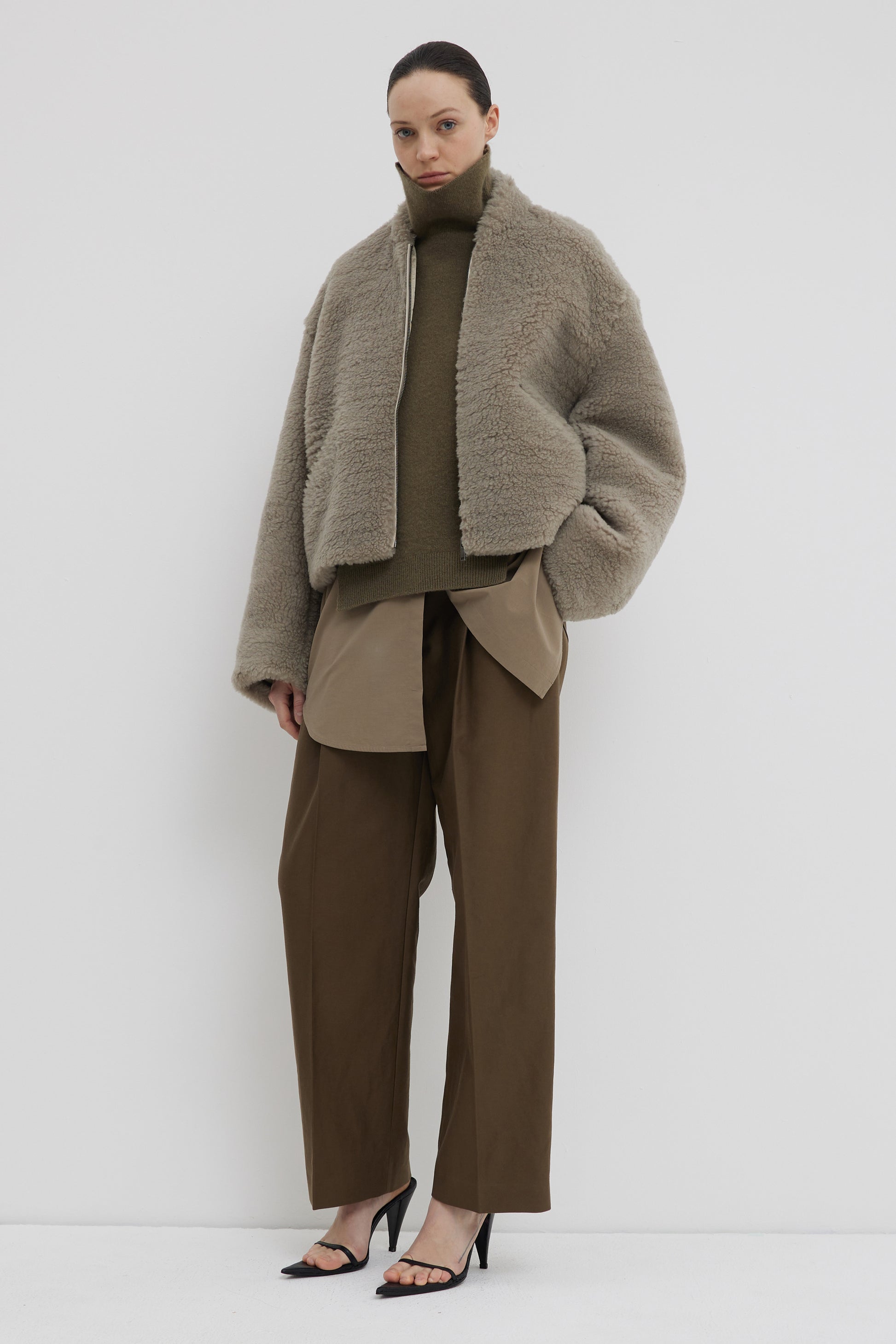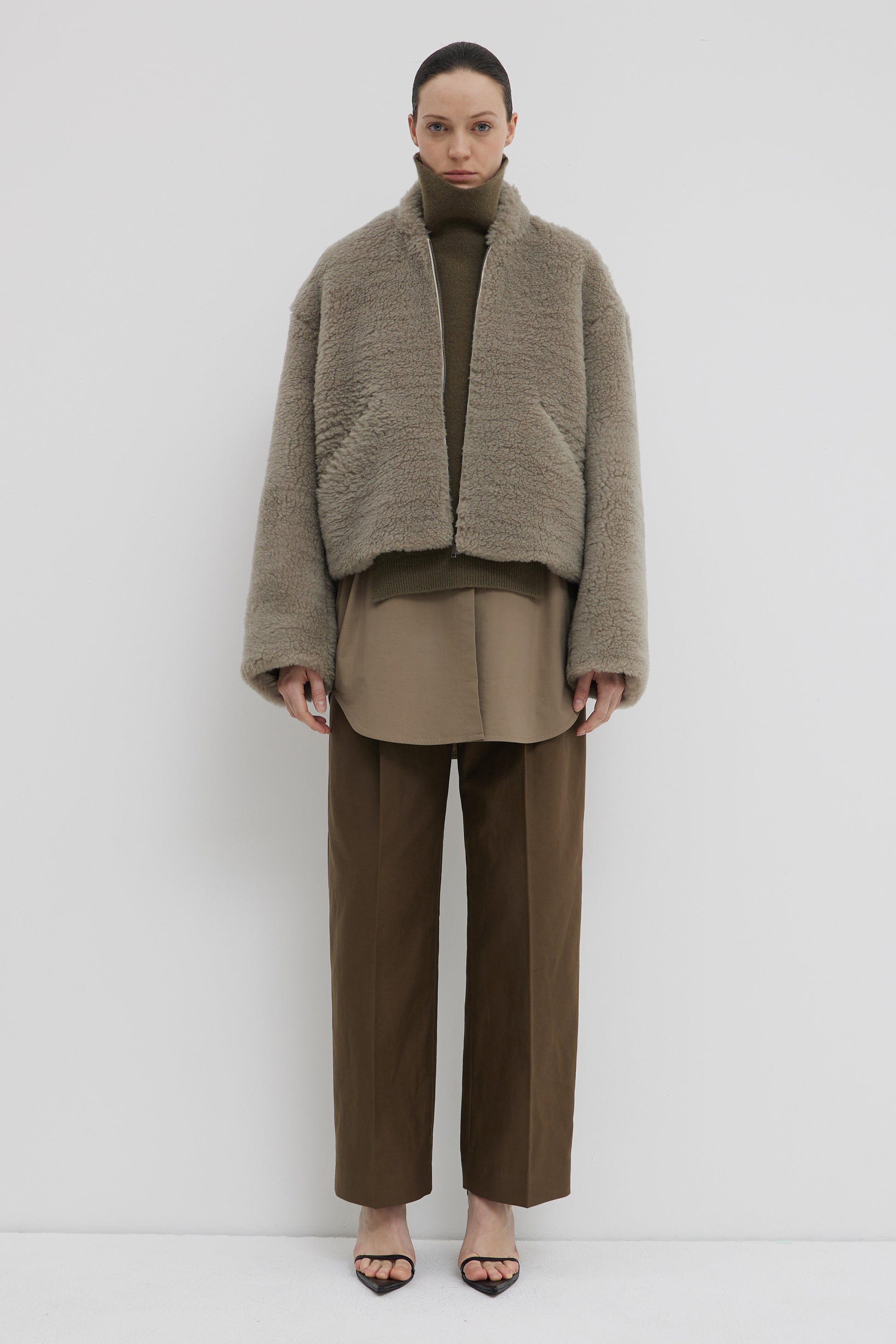 マカダミアウールを使用したボンバージャケット。贅沢で手触りのいい素材でありながら着やすい軽さも持ち合わせているファーブルゾンです。スタンド仕様の襟元からフロントジップに至るまで防寒性も高いのもいいですね。ドロップショルダーのゆったり構築的なデザインはこちらのブランドならでは。隠しポケットもすっきりした印象です。