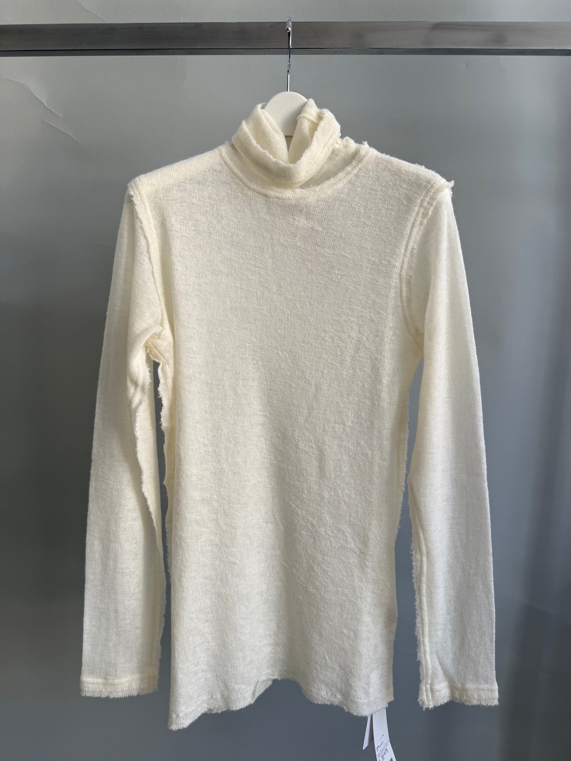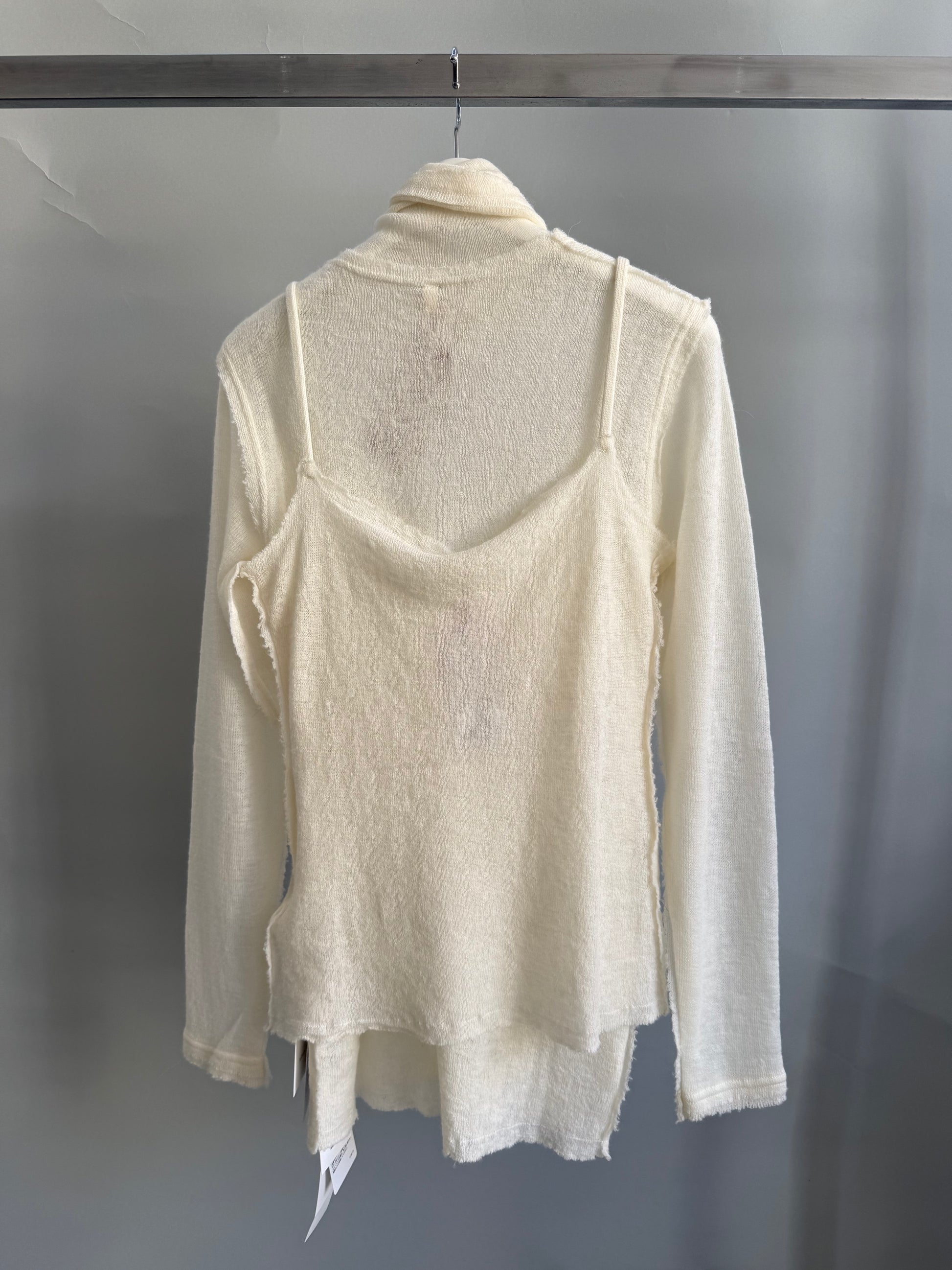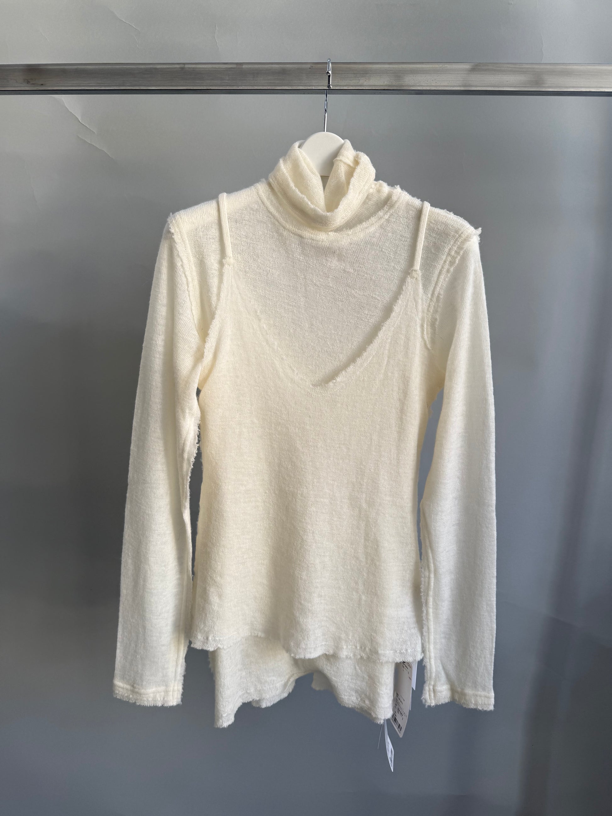 オーガニックのメリノウールを使用したタートルニット。柔らかい着心地のためチクチクするように感じる心配はほぼなさそうです。不揃いな編み地がニュアンスを作り出し、着たときに肌がやんわり透ける雰囲気も絶妙です。同シリーズのキャミソールタイプとの重ね着もおすすめ。