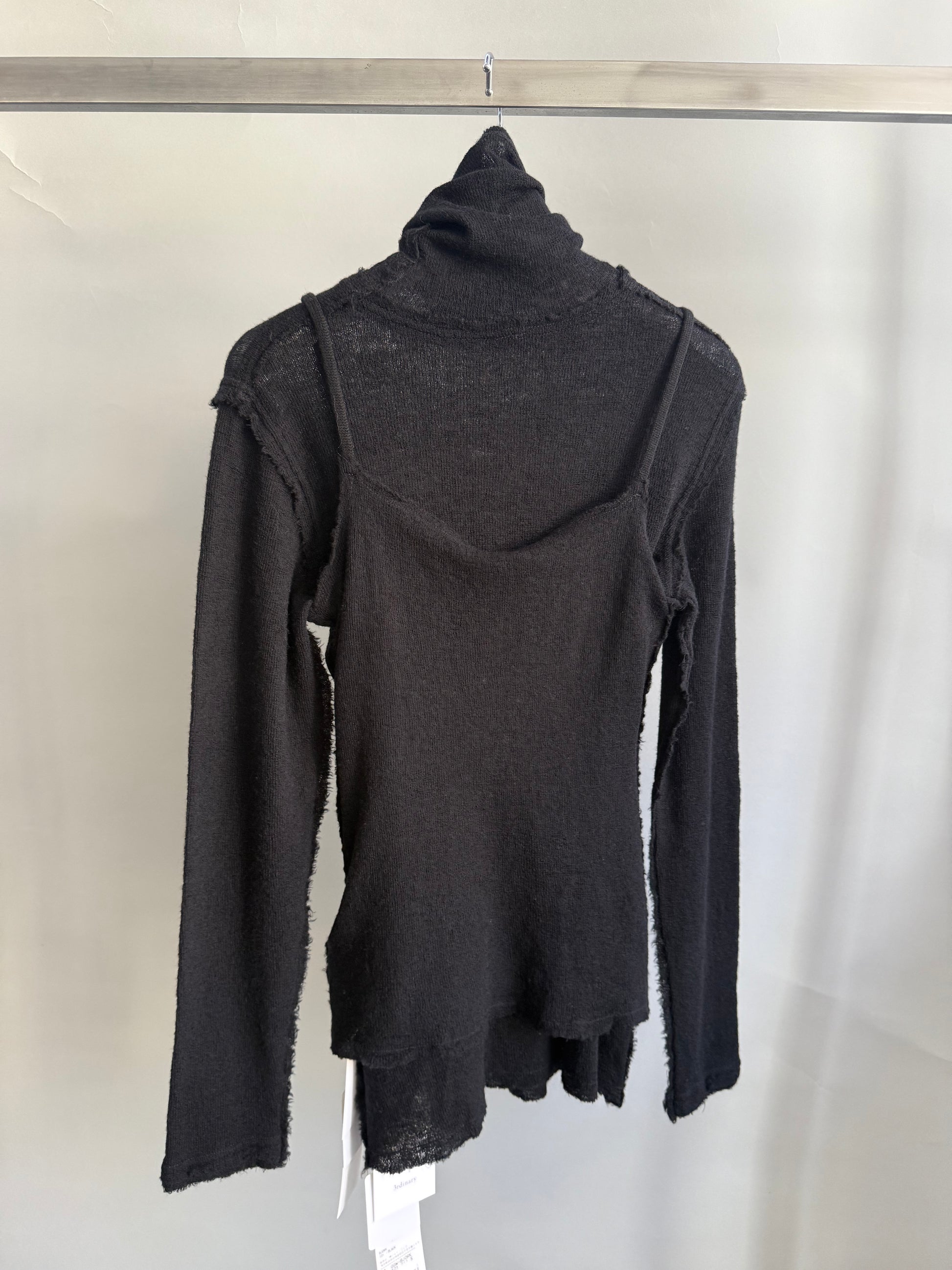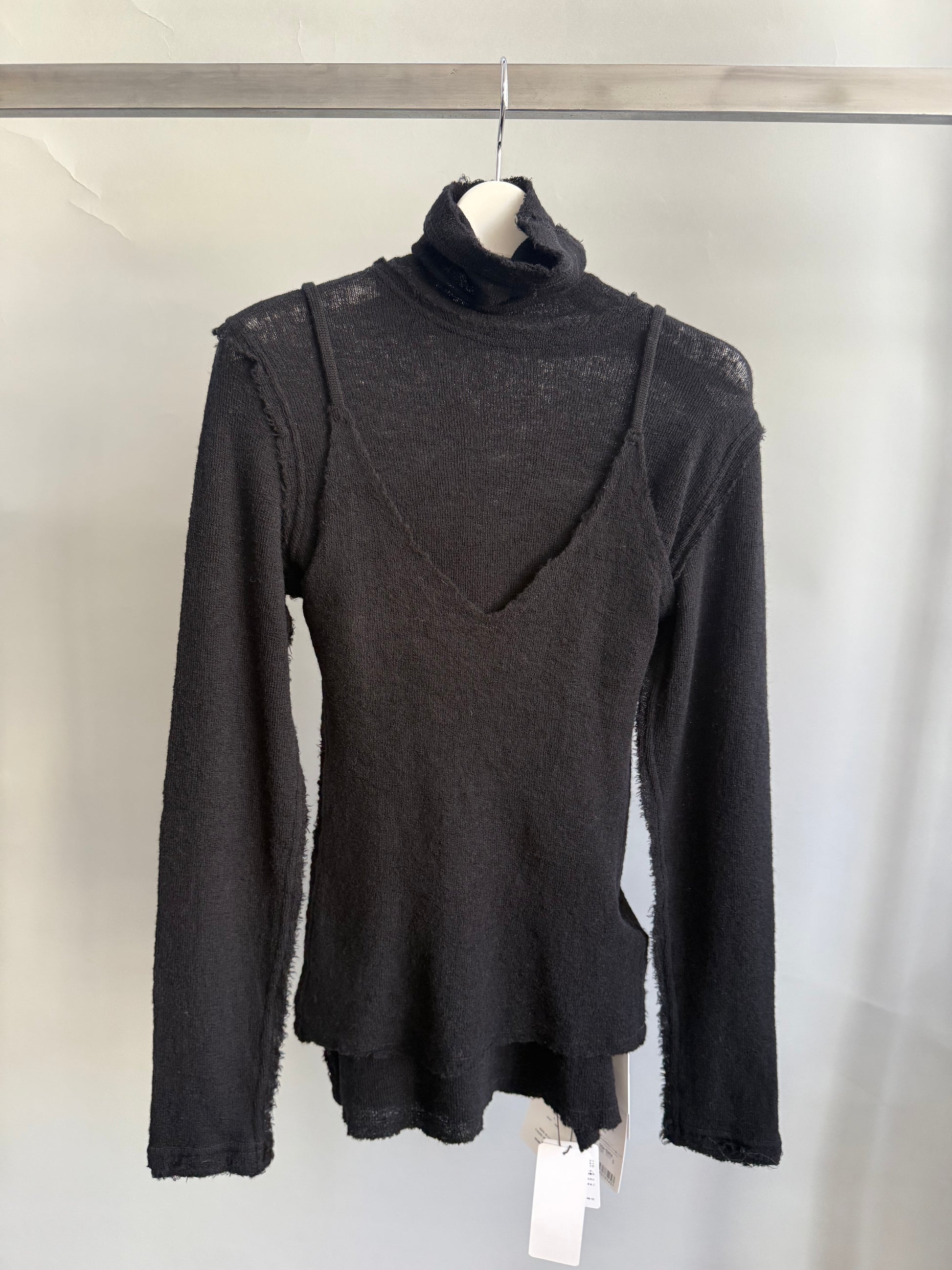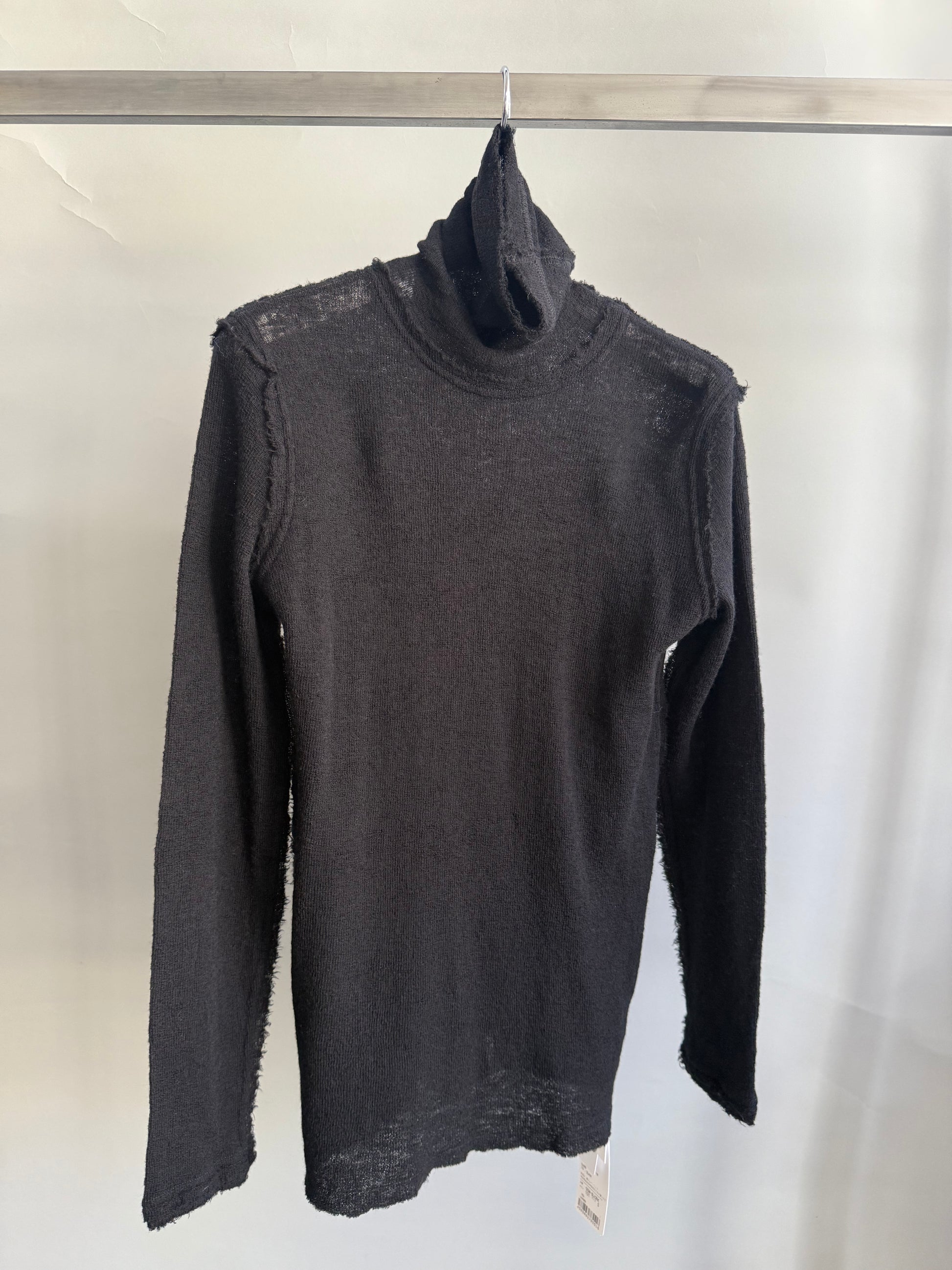 オーガニックのメリノウールを使用したタートルニット。柔らかい着心地のためチクチクするように感じる心配はほぼなさそうです。不揃いな編み地がニュアンスを作り出し、着たときに肌がやんわり透ける雰囲気も絶妙です。同シリーズのキャミソールタイプとの重ね着もおすすめ。