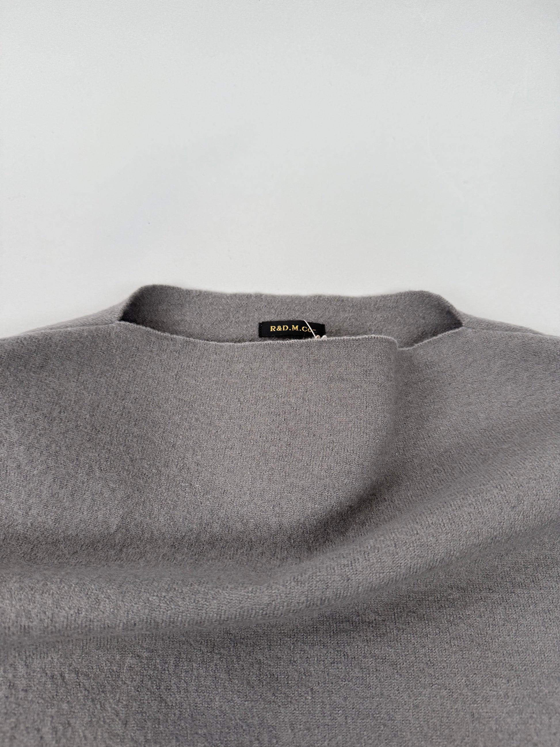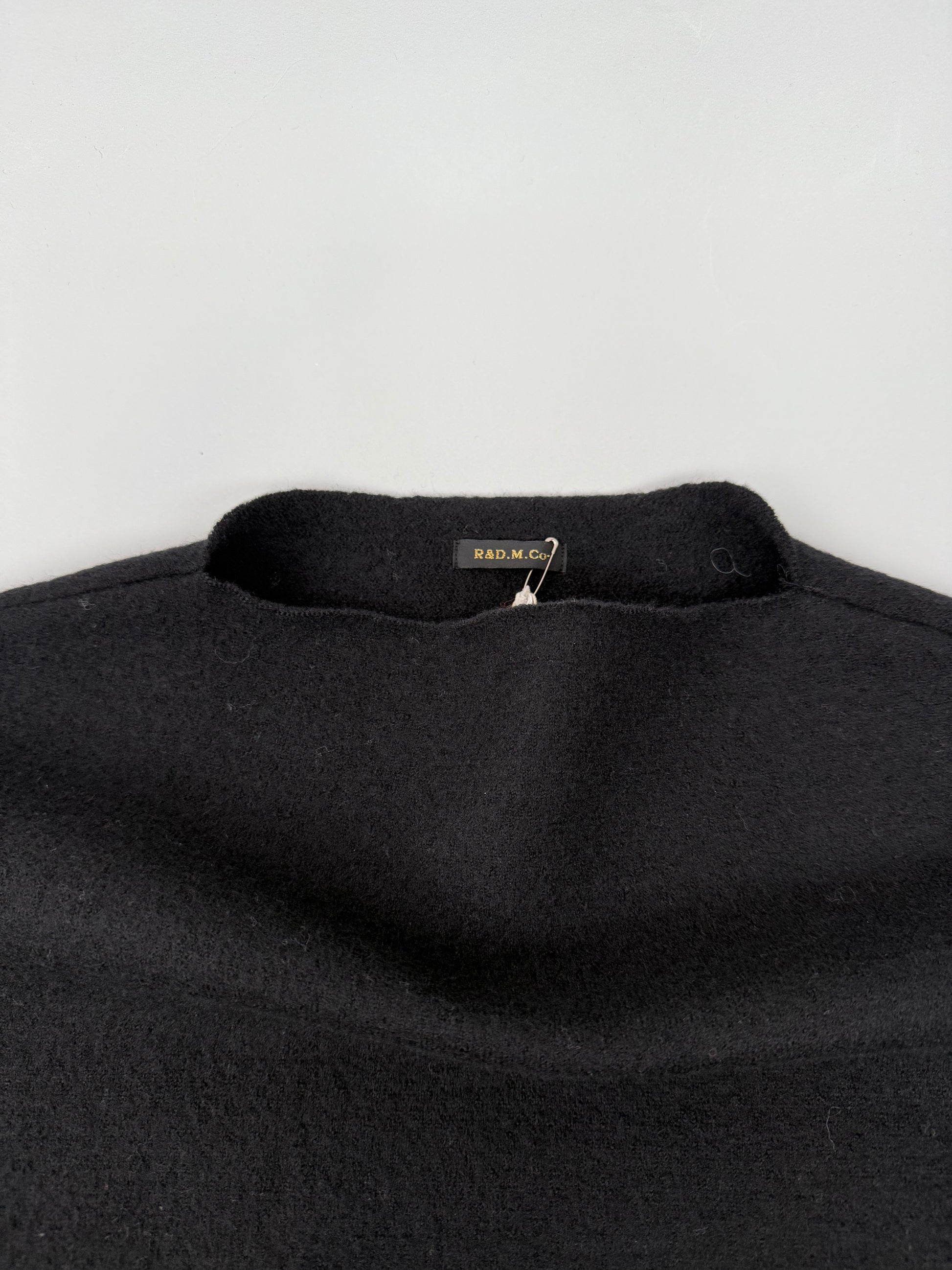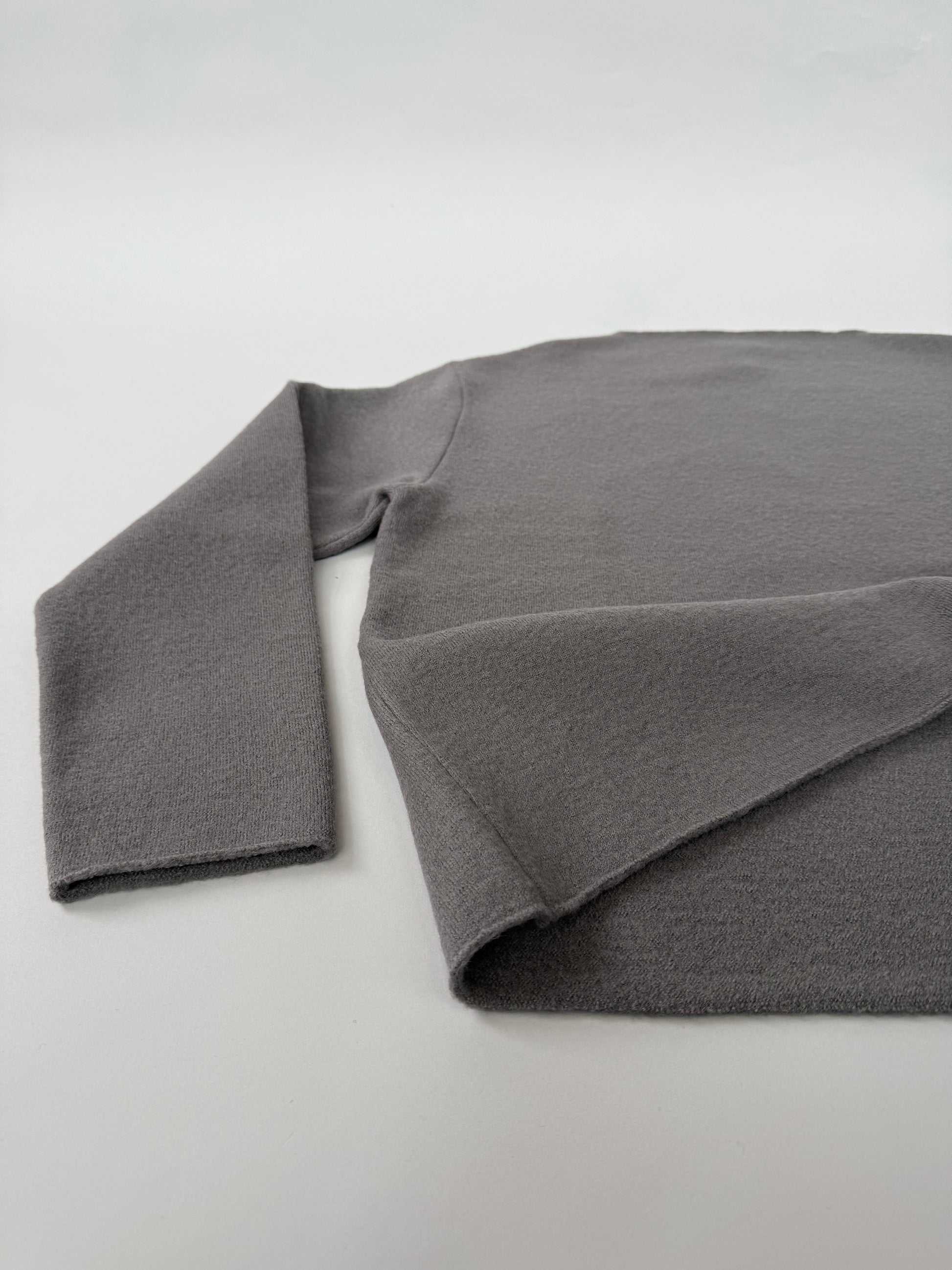 通常のニットよりハリがあり、目が詰まっているため、保温性に優れ、軽くて柔らかいのが特徴です。フェルトのような見た目と柔らかさがあり、裾や襟ぐりは切りっぱなしのデザインで仕上げられています。体の線を拾わない素材感や、やや広めの身幅も着やすさに繋がる一枚です。