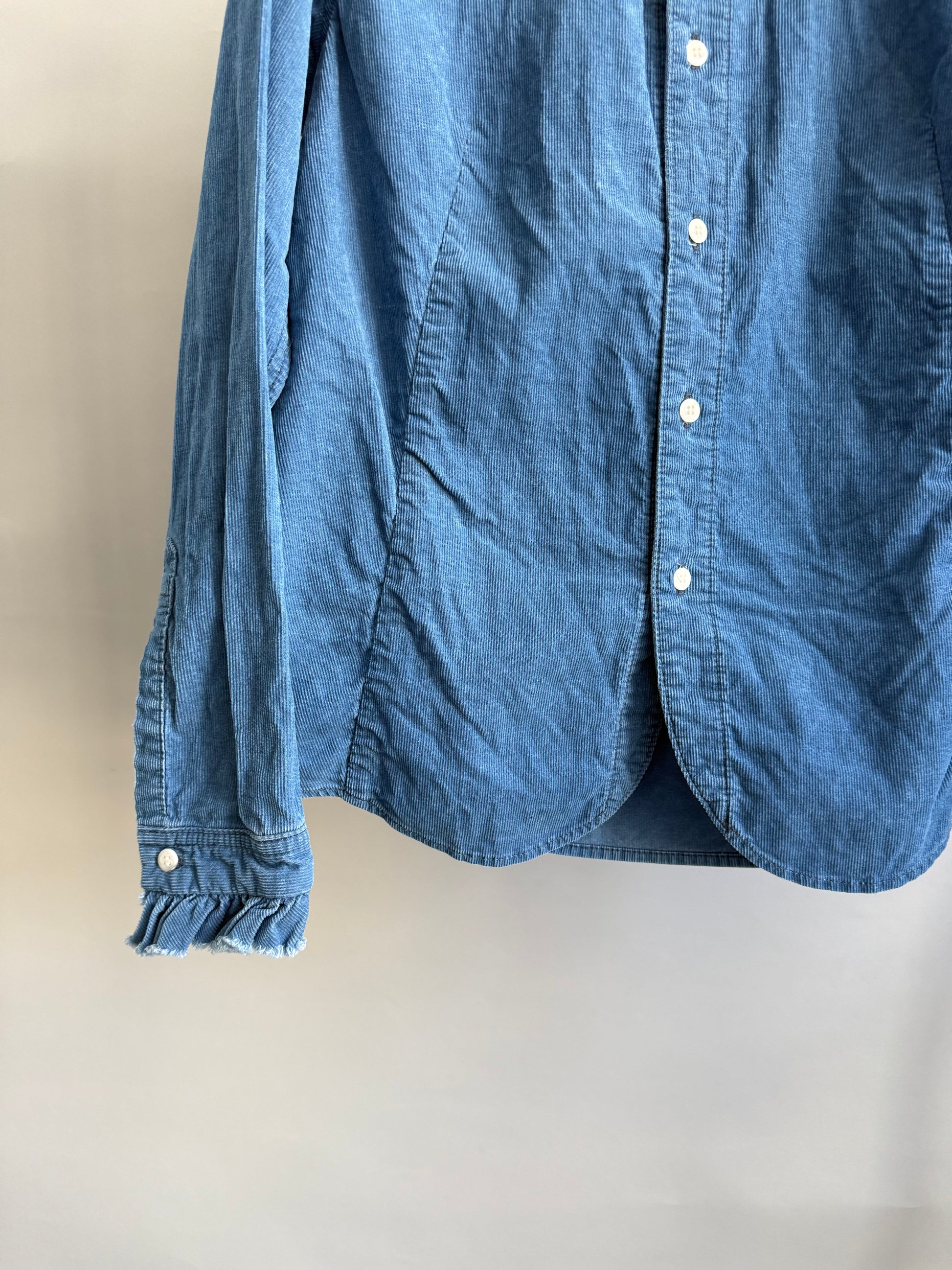 襟のフリルが際立つコーデュロイシャツ。細めのコーデュロイ幅なのですっきりとした印象となっています。重ね着としても、羽織としても鼻広くコーディネイト出来そうです。