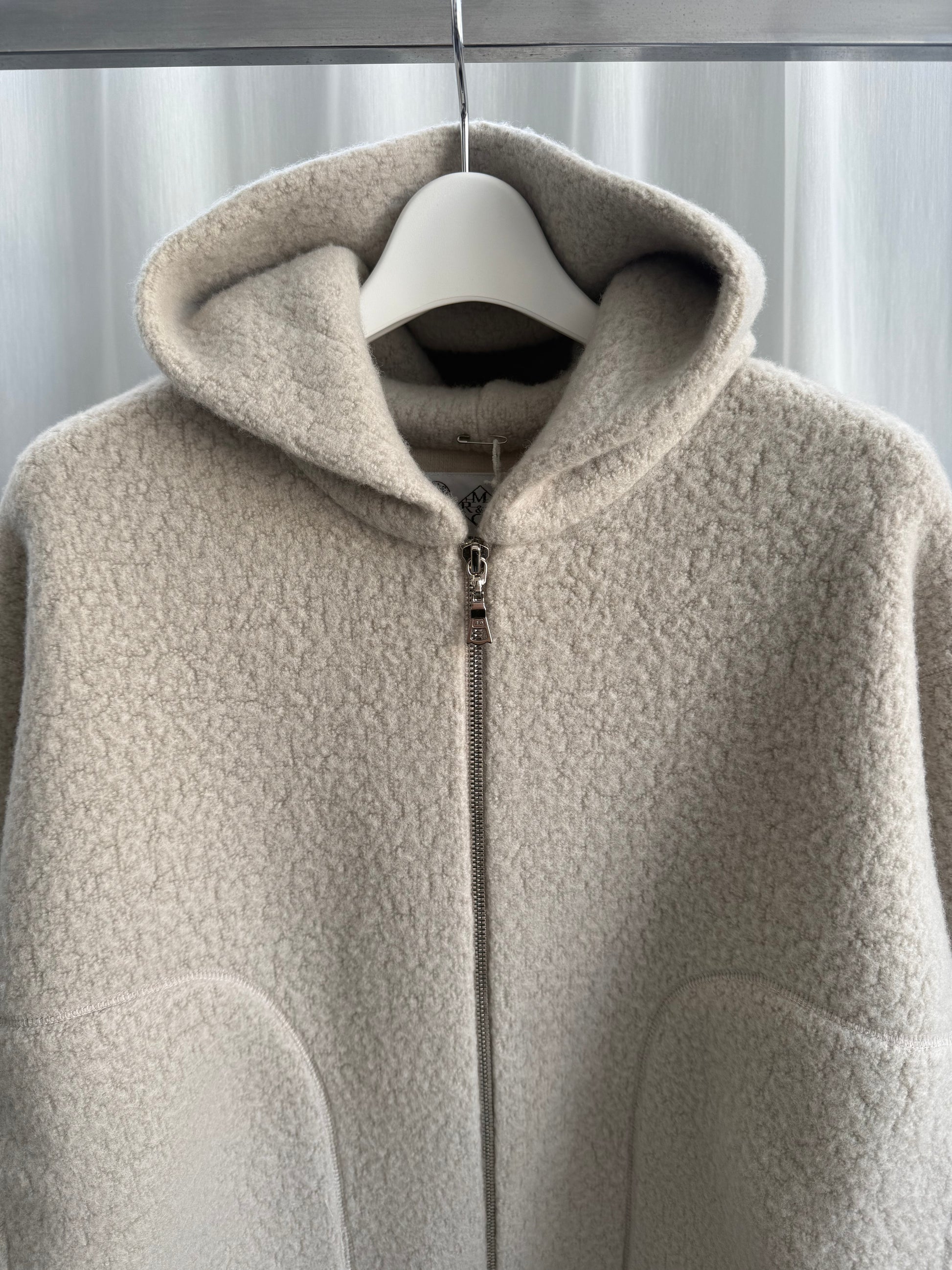 羊の毛のようにモコモコしたボア素材のジップパーカー。細過ぎず太過ぎずのシルエットですが袖幅がゆったりしているためストレスフリーな着心地です。大きめの両ポケットやシームレスなステッチも上品で可愛いアクセントになっています。同シリーズからスェットパンツも展開しています。